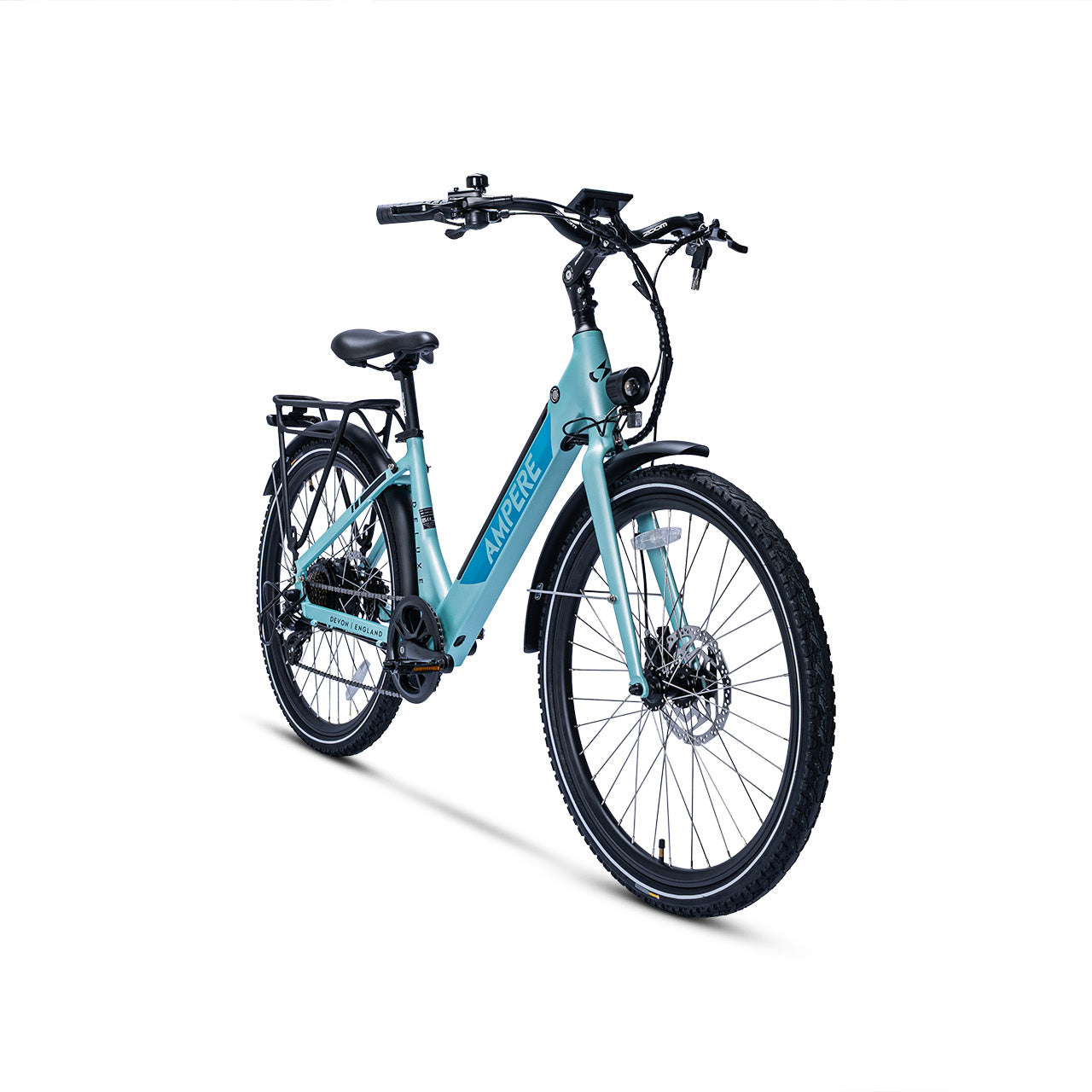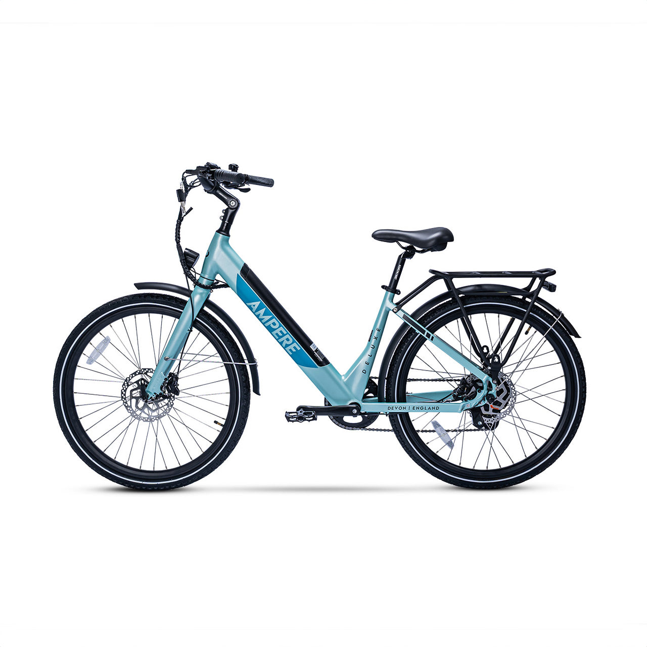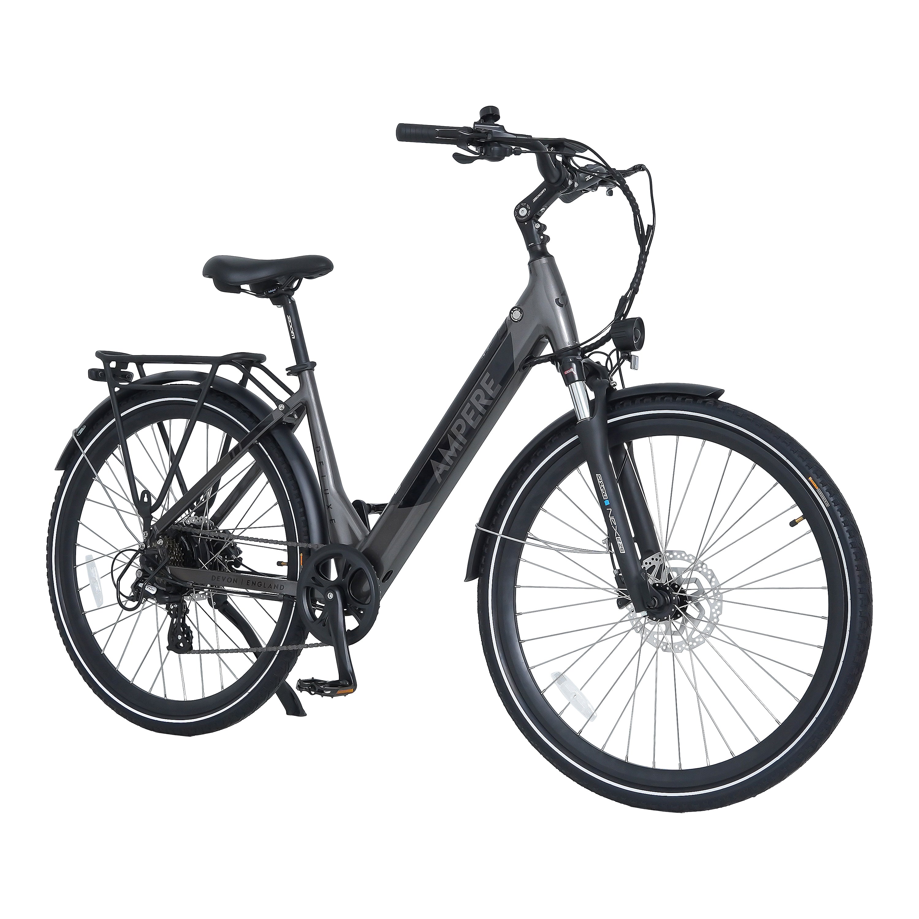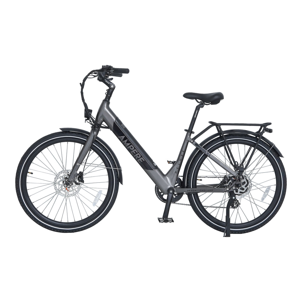 The Ampere Deluxe remains highly versatile, available in two frame sizes—16" for riders under 5'4" and 18" for those over 5'4"—making it the ideal choice for a wide range of riders. It also includes thoughtful extras such as a kickstand, pannier rack, mudguards, and integrated front and rear lights.