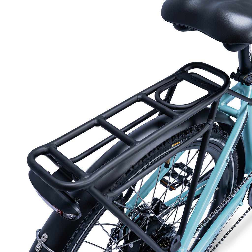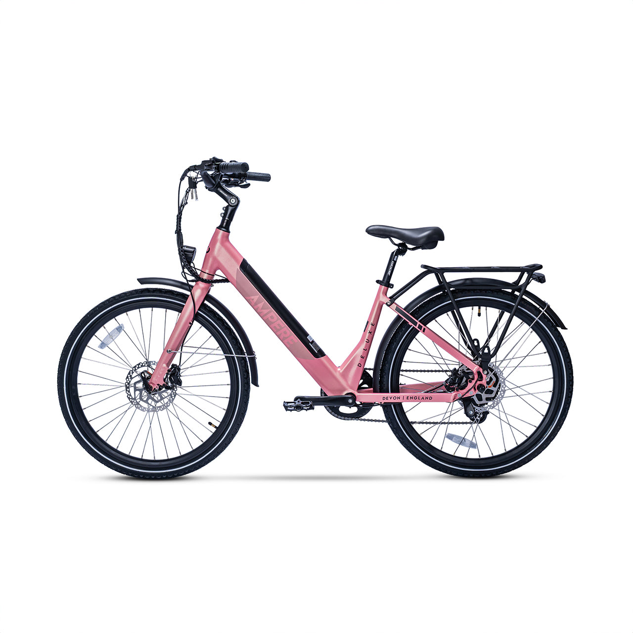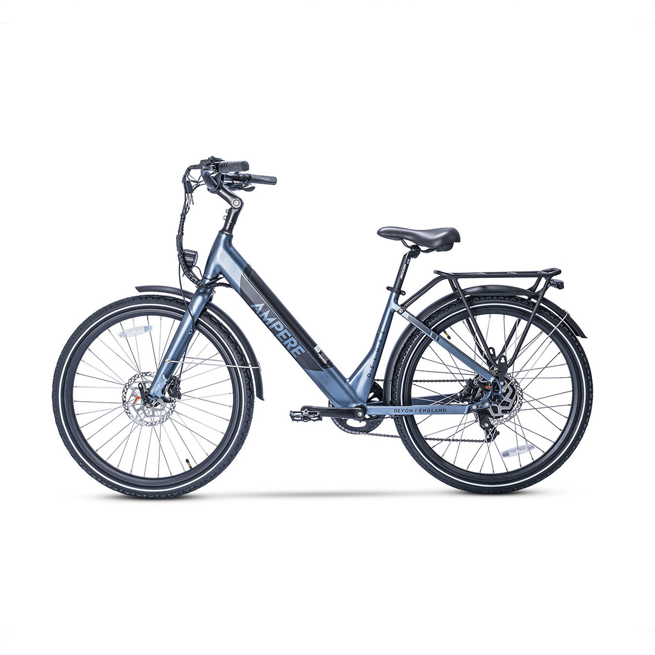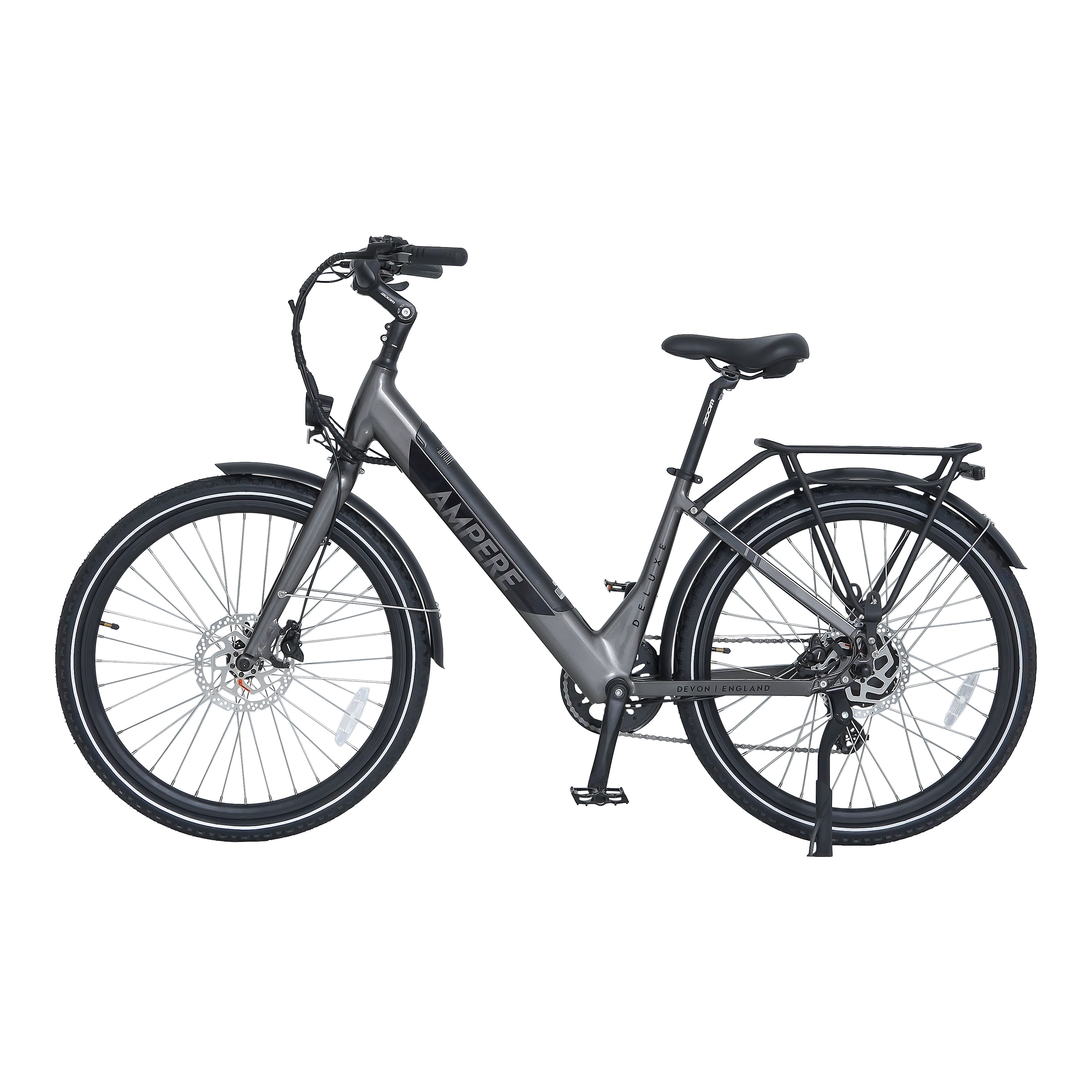 The Ampere Deluxe remains highly versatile, available in two frame sizes—16" for riders under 5'4" and 18" for those over 5'4"—making it the ideal choice for a wide range of riders. It also includes thoughtful extras such as a kickstand, pannier rack, mudguards, and integrated front and rear lights.